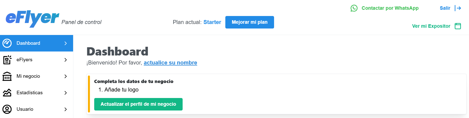 Una vez finalizado el alta, accederás al panel de control, desde donde podrás gestionar tu eFlyer